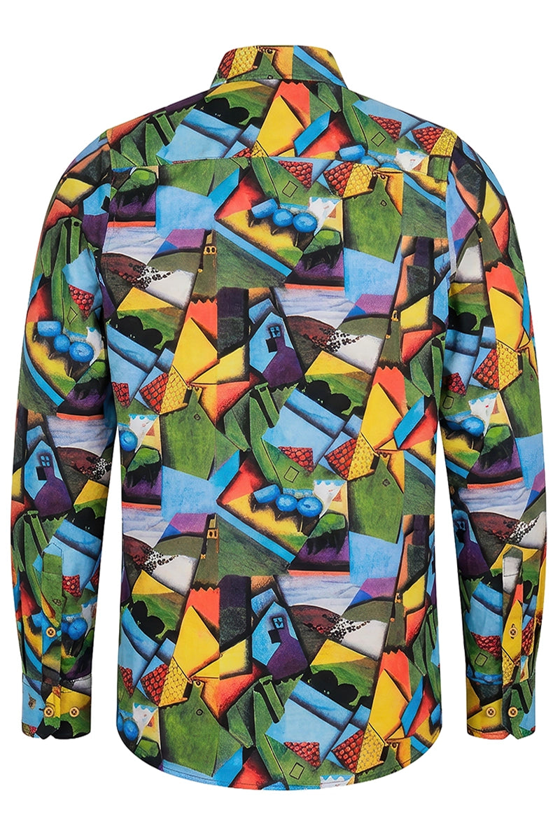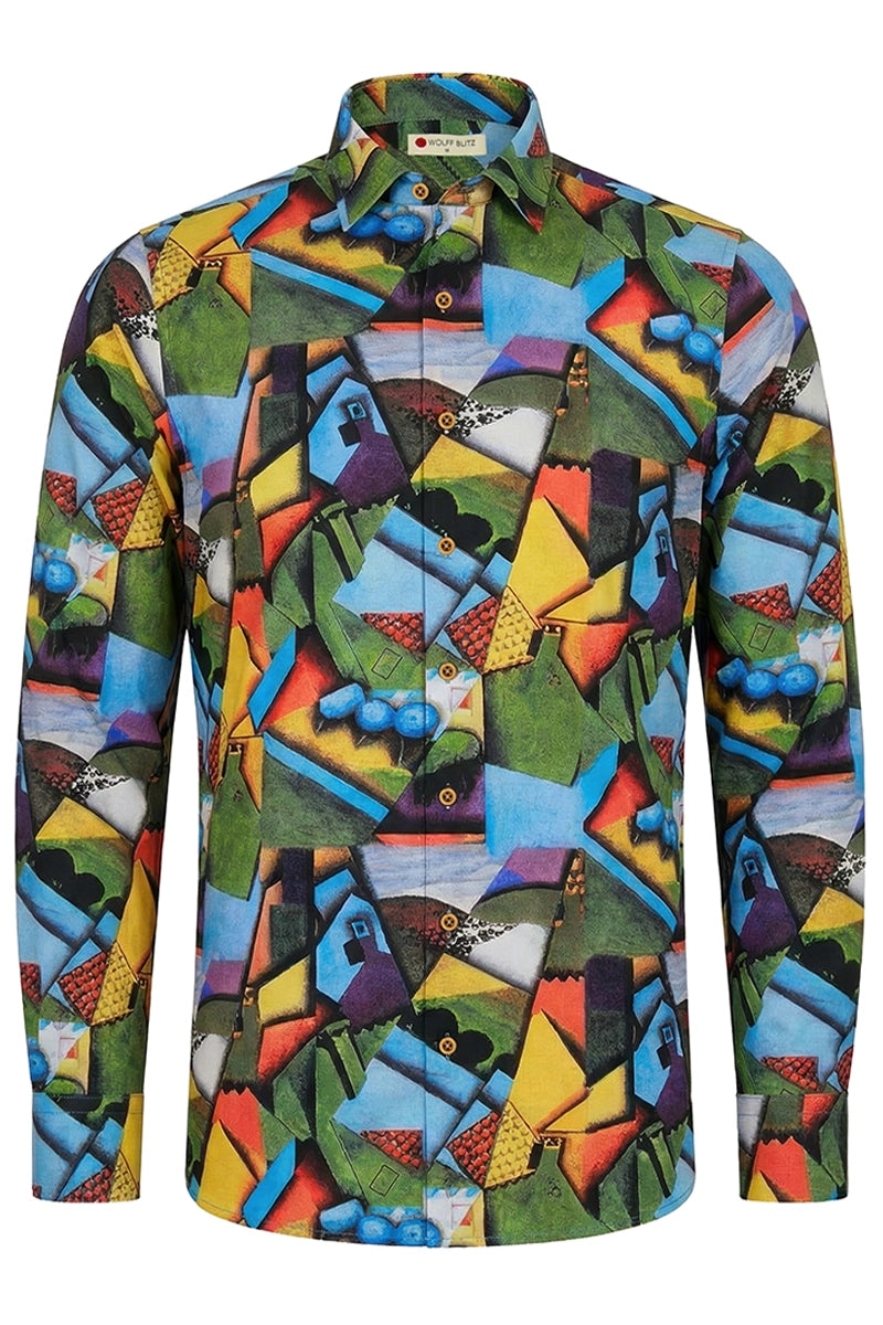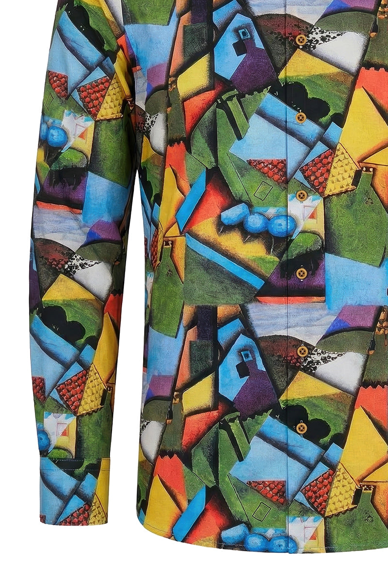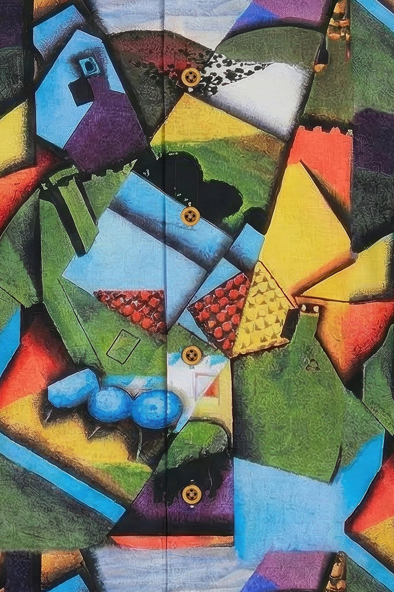 kubistische Vision durch klare Geometrie und harmonische Balance. Die Komposition verwandelt die Stadt in ein rhythmisches Zusammenspiel von Formen und Farben. Das Design verleiht moderner Mode eine zeitlose Kunstästhetik.