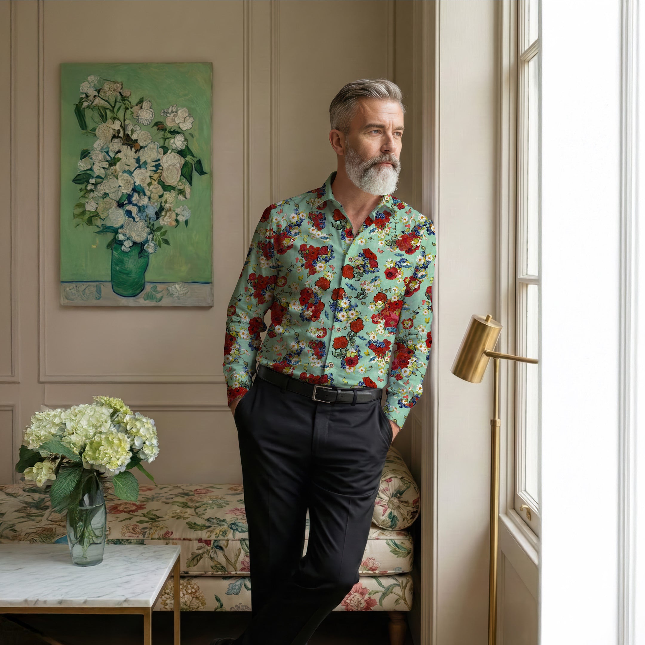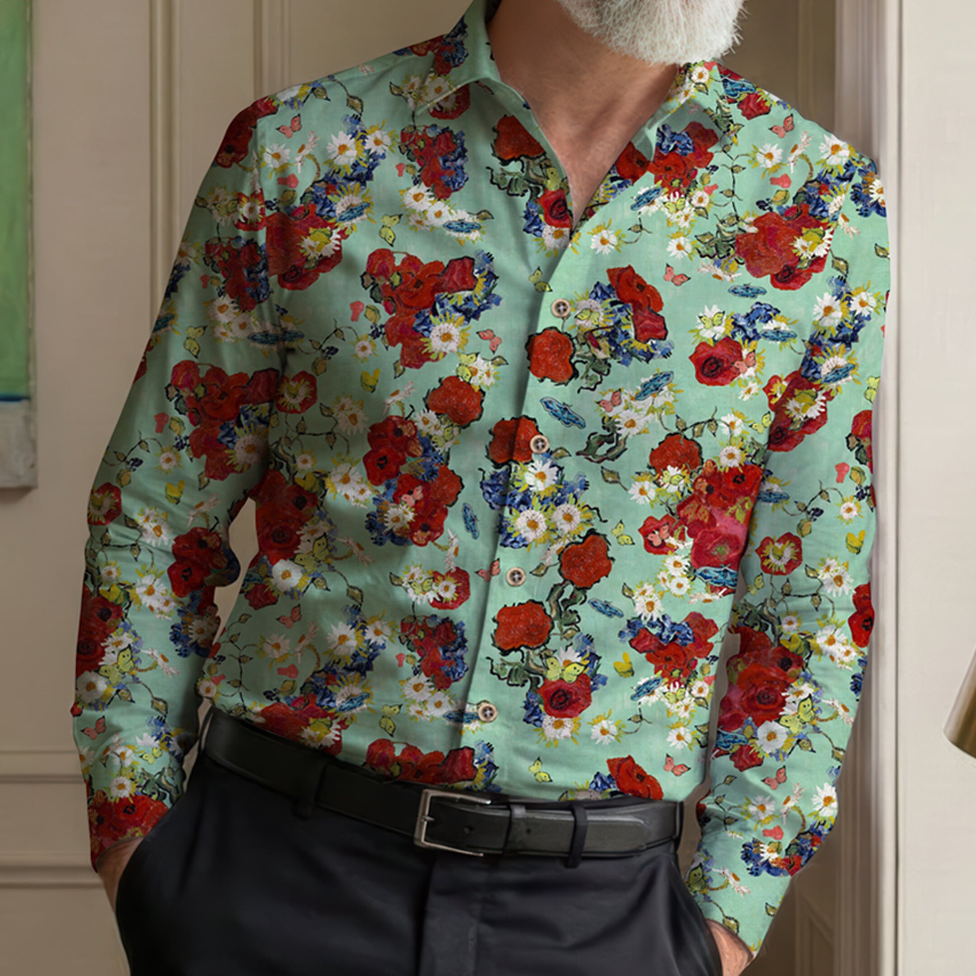 Vase mit Margeriten und Mohnblumen zeigt Vincent van Goghs ausdrucksstarke Farbgebung und Pinselführung. Die leuchtenden Blumen vermitteln Bewegung, Emotion und Intensität in einem einfachen Alltagsmotiv. Dieses Design bringt die Energie des Post-Impressionismus in eine moderne, tragbare Form.Mode eine zeitlose Kunstästhetik.