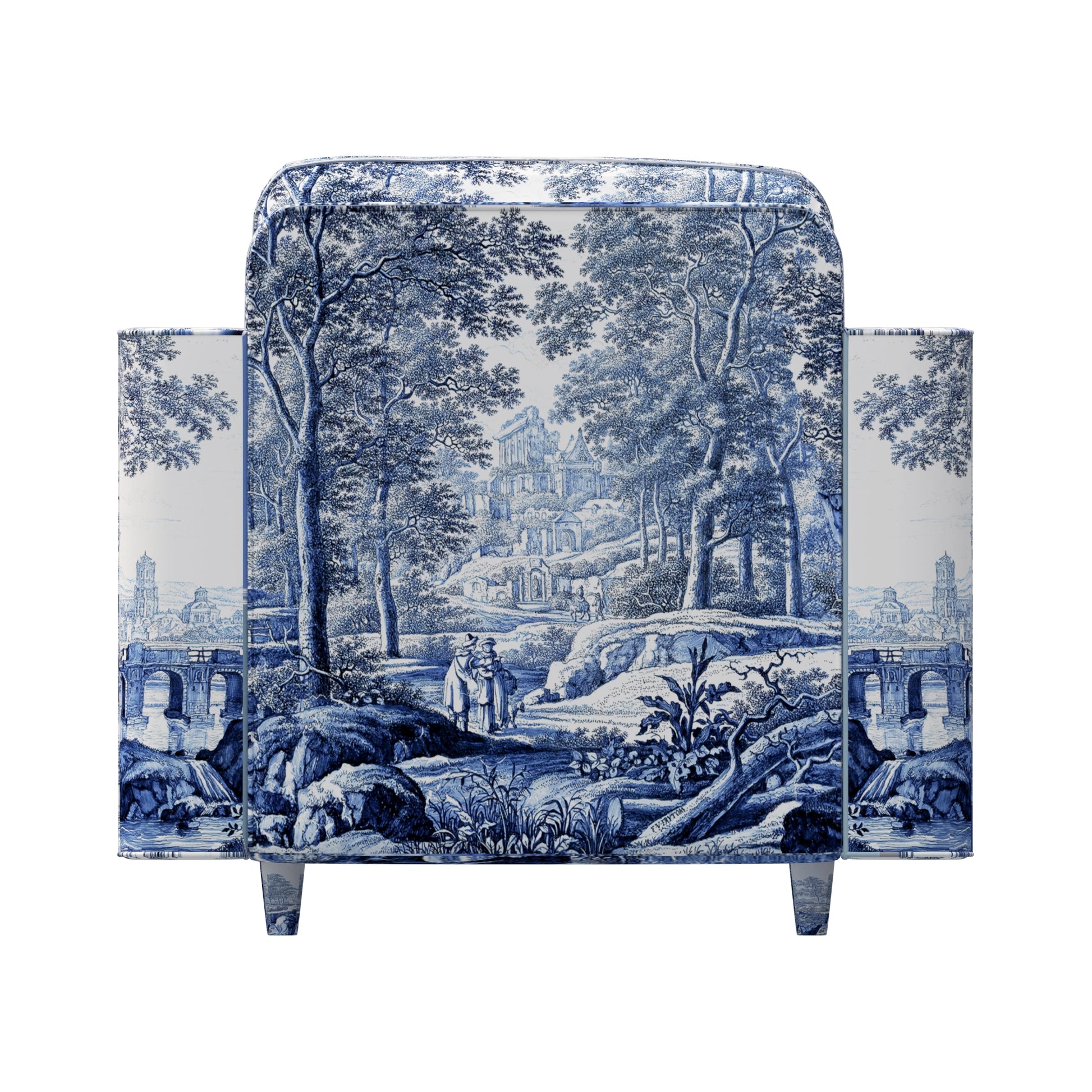 Geïnspireerd door het Delfts aardewerk en de sfeervolle taferelen van de Nederlandse kunstenaar Frederik van Frytom uit de Gouden Eeuw, is deze fauteuil een meesterlijke mix van comfort en kunst. Hij legt de delicate, serene schoonheid van blauw-witte landschapsschilderkunst vast in een eigentijdse, sculpturale vorm.