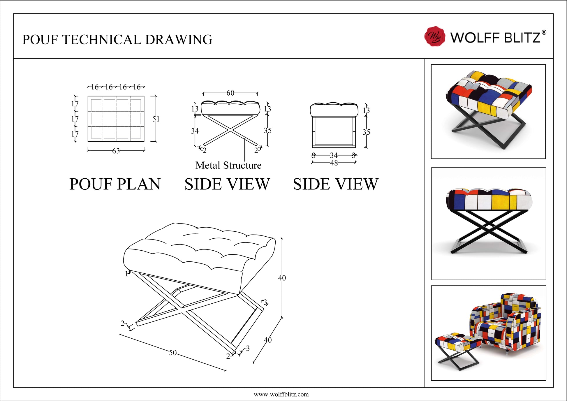 De poef is gemaakt van een solide metalen constructie en gelaagd HR-schuim (High Resilience Foam) voor langdurig comfort. Hij is bekleed met onze exclusieve stof, die Mondriaans kenmerkende esthetiek weerspiegelt met strakke lijnen en levendige kleurvlakken. Meer dan alleen een accessoire, het is de perfecte aanvulling op de Piet Mondrian Curve Fauteuil. Samen vormen ze een compleet ensemble dat ontspanning tot een kunstvorm maakt.