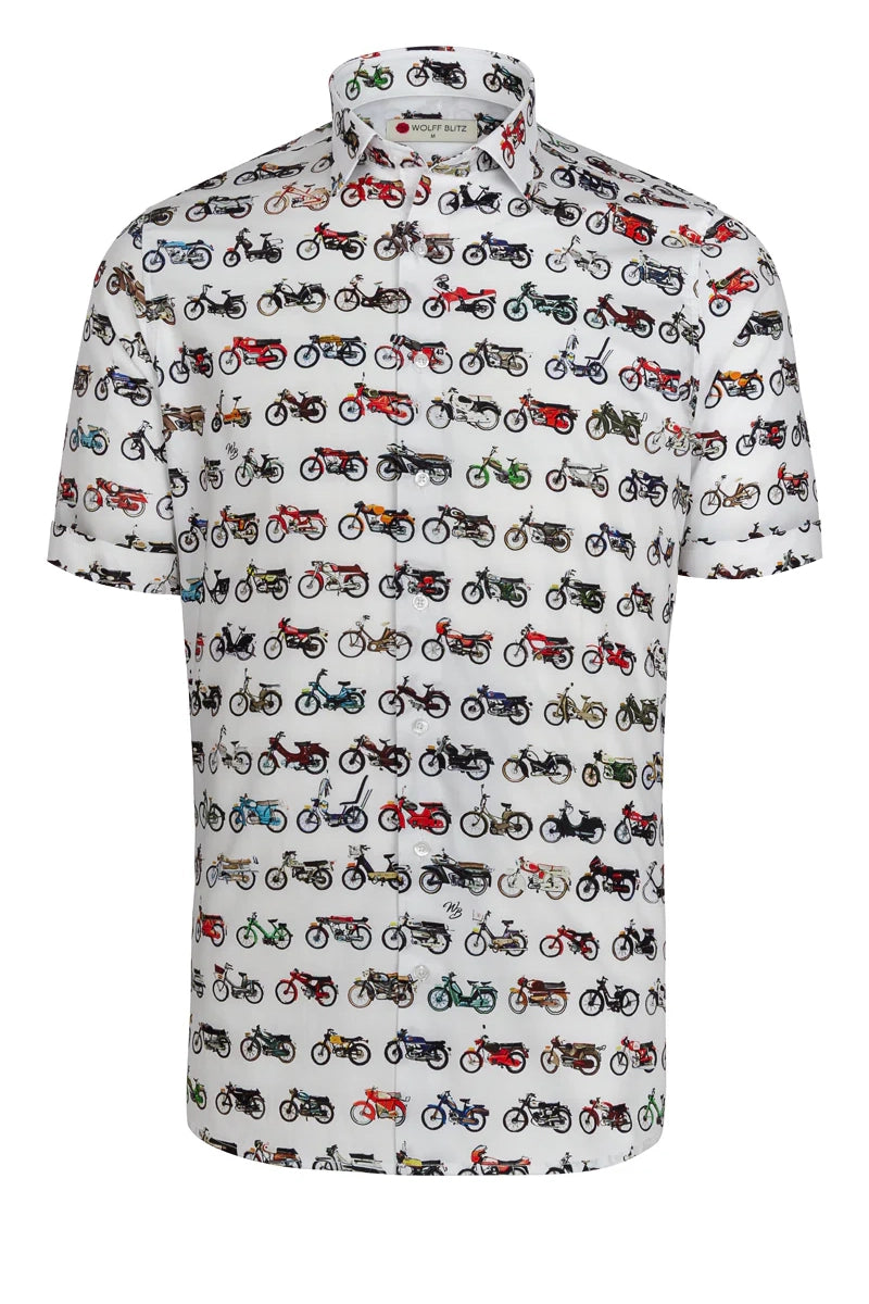 Show your love for vintage mopeds with this distinctive shirt featuring detailed illustrations of iconic classic bikes, by Jan Bijvank. Designed for comfort and standout style, it's a perfect choice for motorcycle enthusiasts or anyone who appreciates timeless designs.